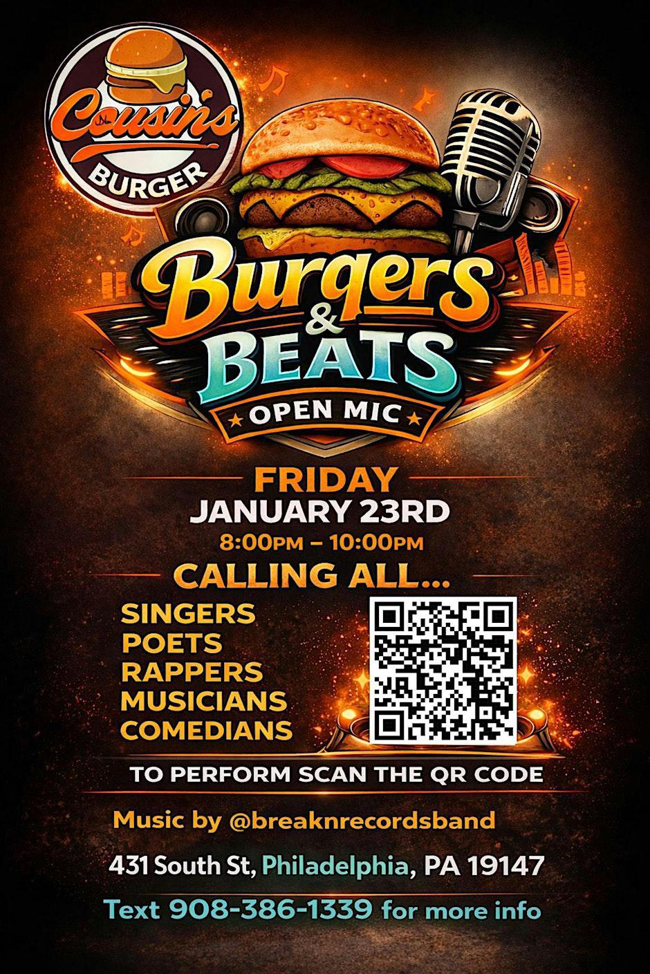 Get Ready for BURGERS & BEATS OPEN MIC AT COUSINS BURGER!